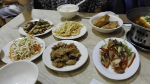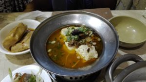 支払いを済ませたら、テーブルに着いて食事を楽しむだけ。お粥には黄金いもが入っていて、鍋のままでテーブルに運ばれます。お粥は食べ放題ですので、店員に言えばお代わりを持って来てくれます。